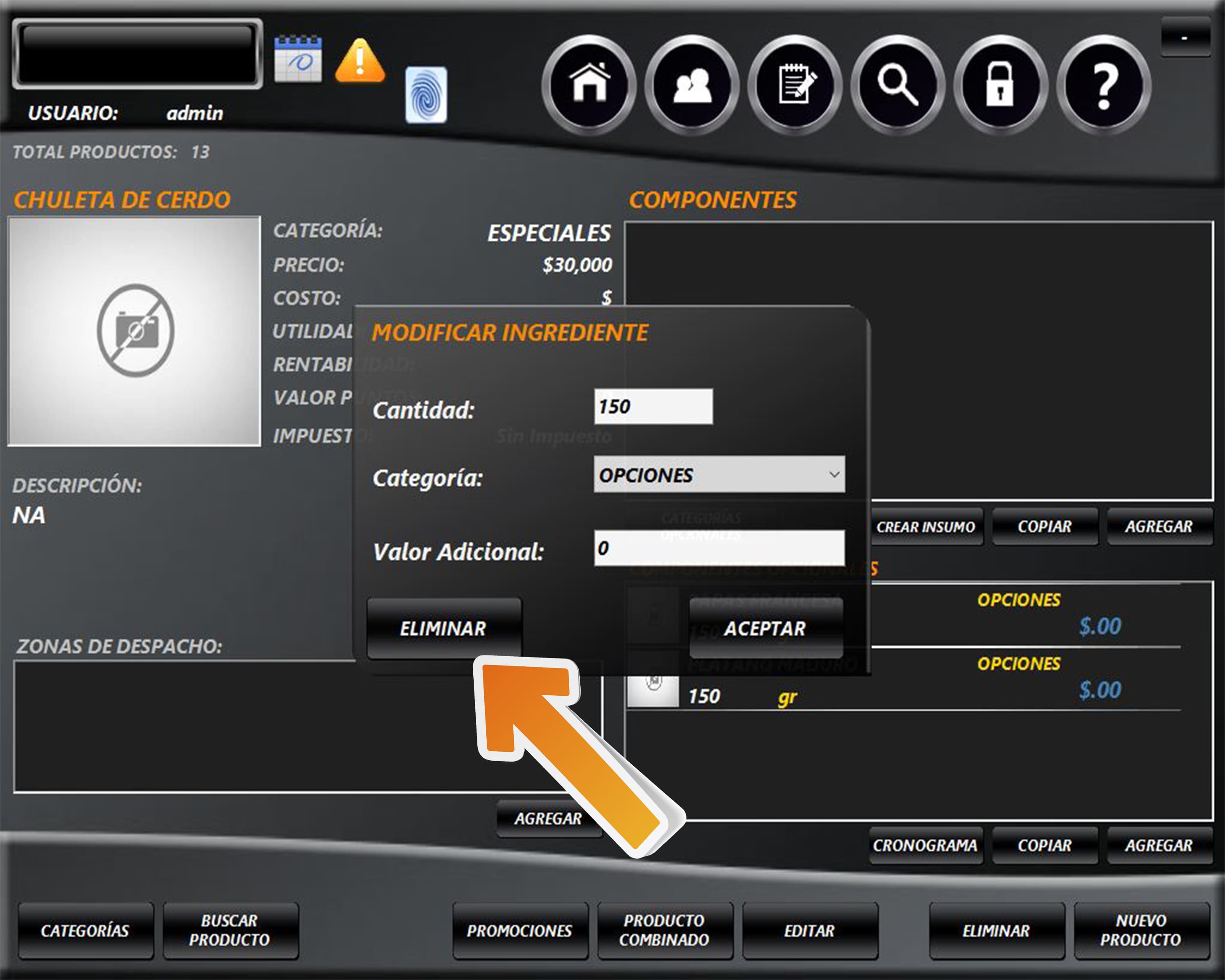 Busque el producto y bajo el panel de INGREDIENTES OPCIONALES / COMPONENTES OPCIONALES seleccione el insumo que se va a eliminar.