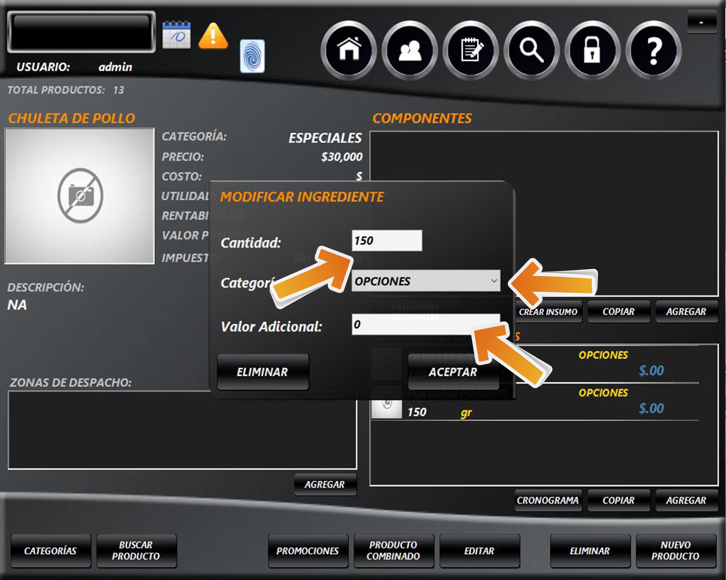 Busque el producto y bajo el panel de INGREDIENTES OPCIONALES / COMPONENTES OPCIONALES seleccione el insumo que va a modificar