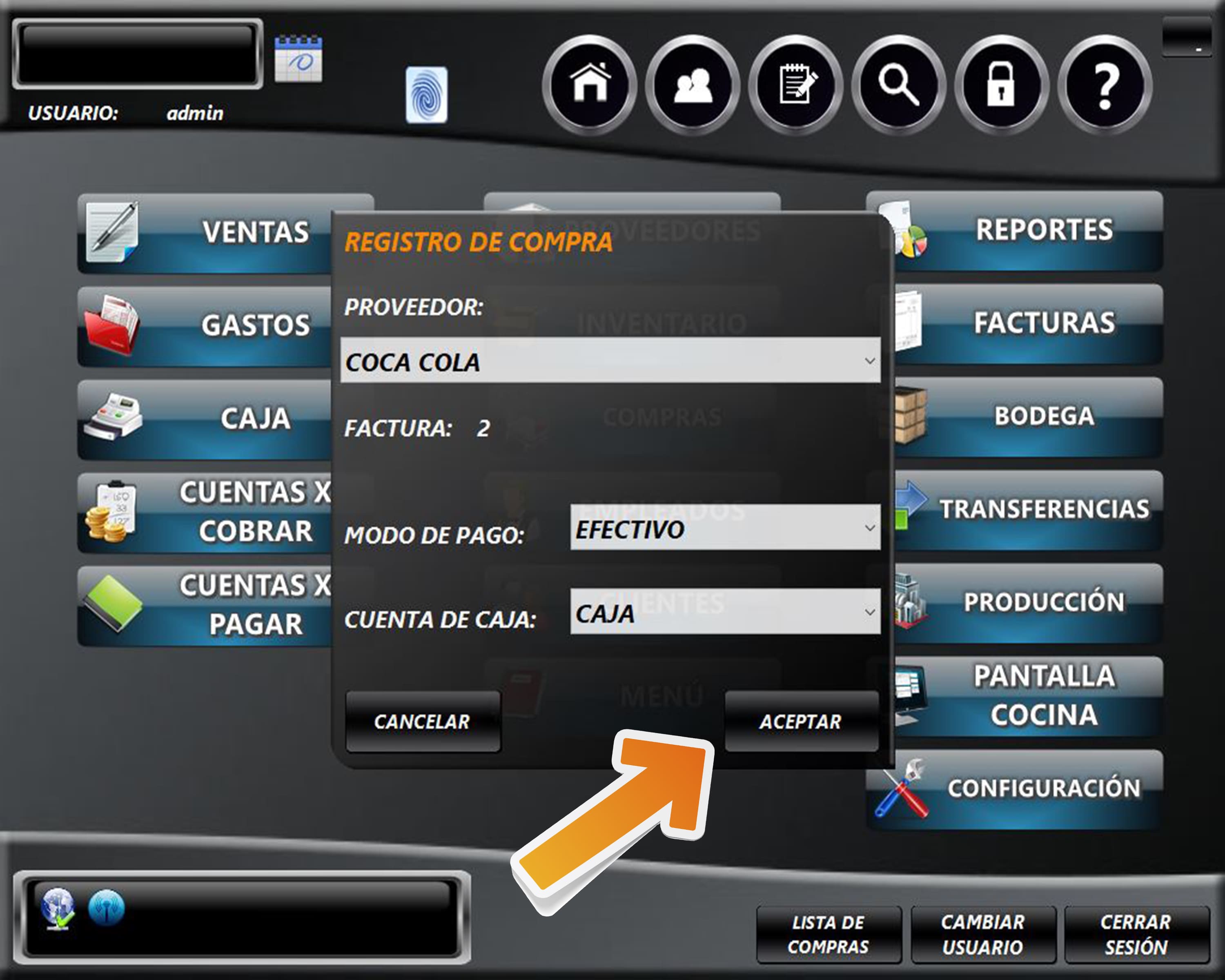 Seleccione el proveedor al cual se le realiza la compra, el modo de pago y la cuenta a debitar en caso de que el modo de pago sea efectivo. Dé clic en ACEPTAR.