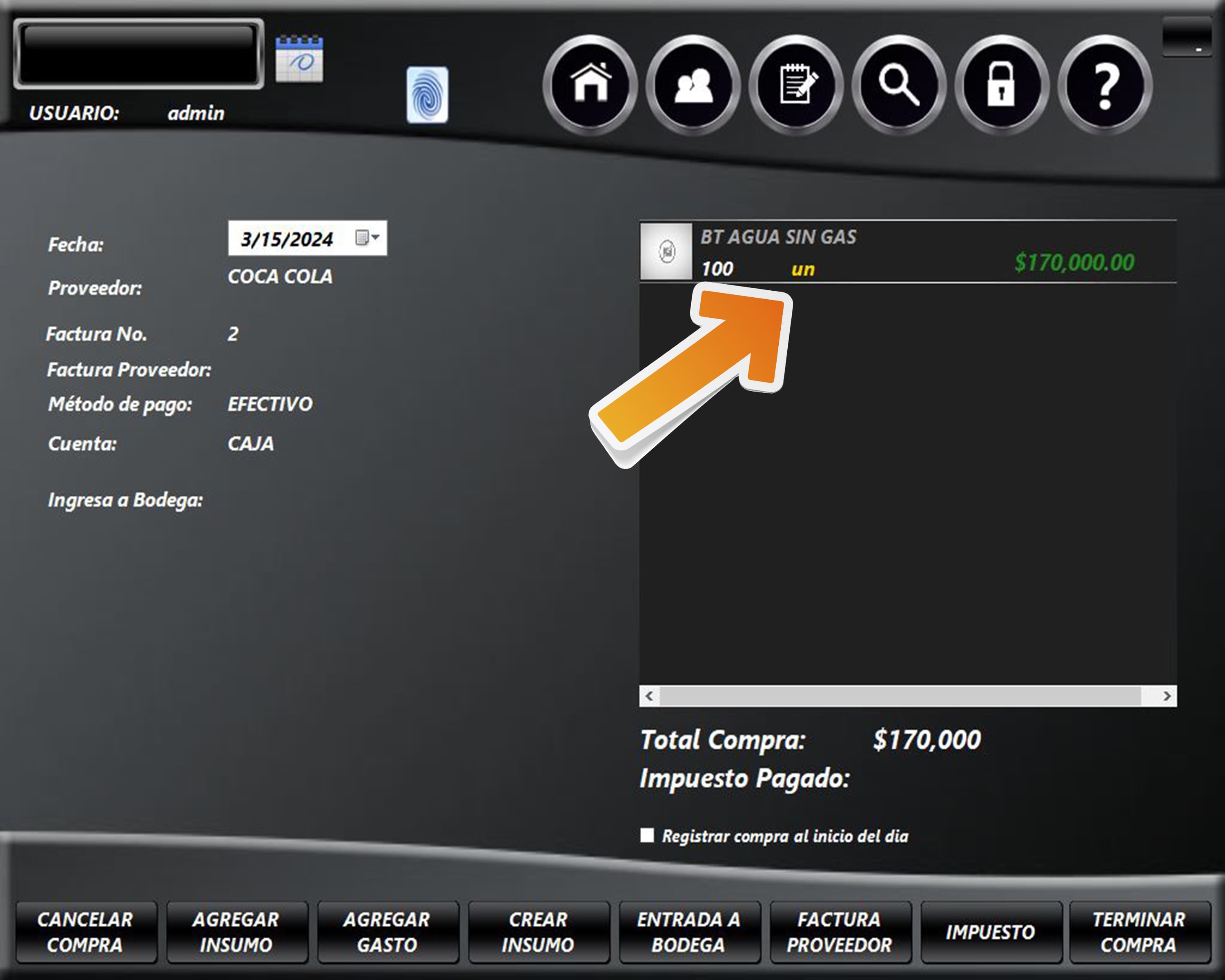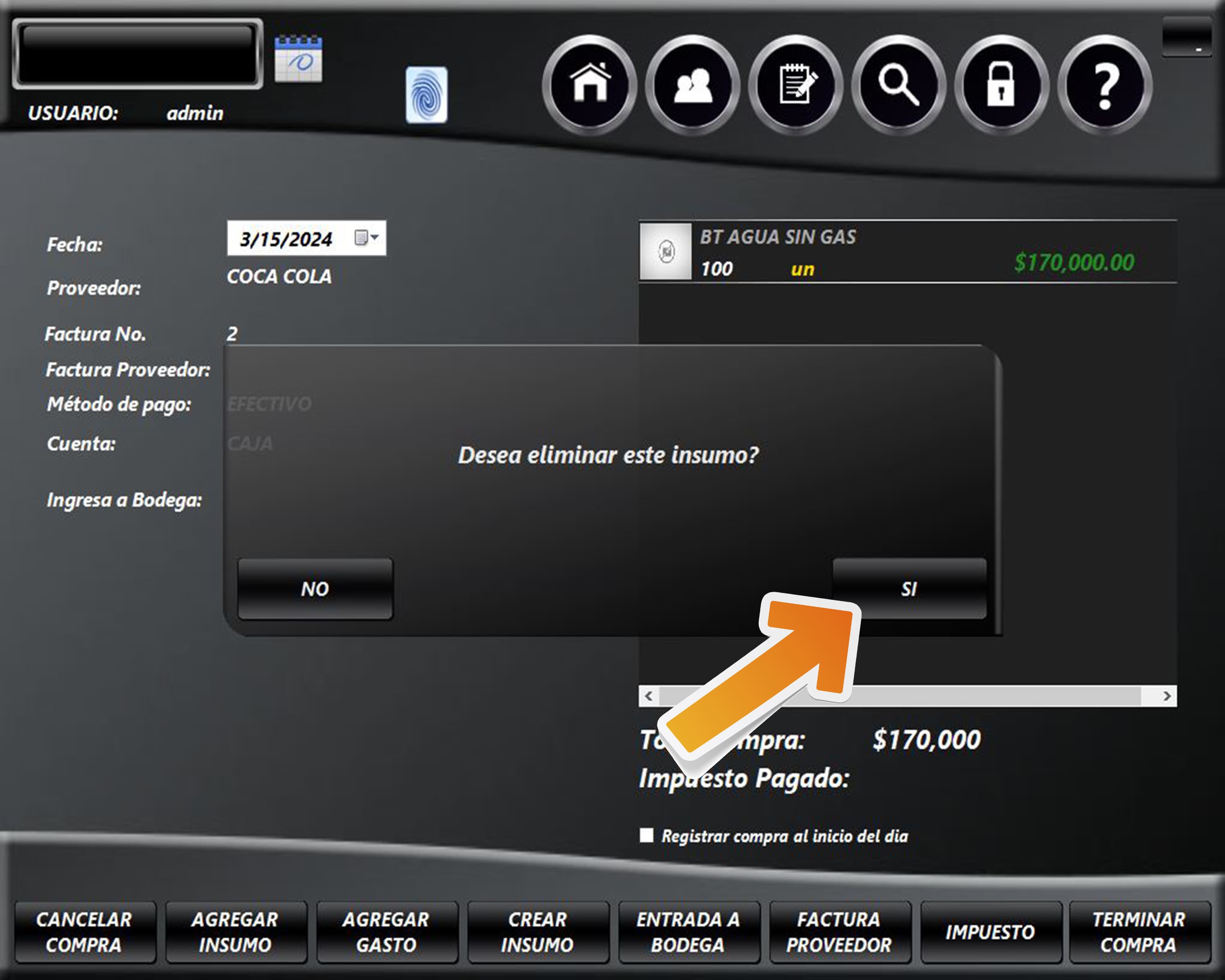 Para eliminar un insumo del registro de la compra ingrese al módulo COMPRAS.