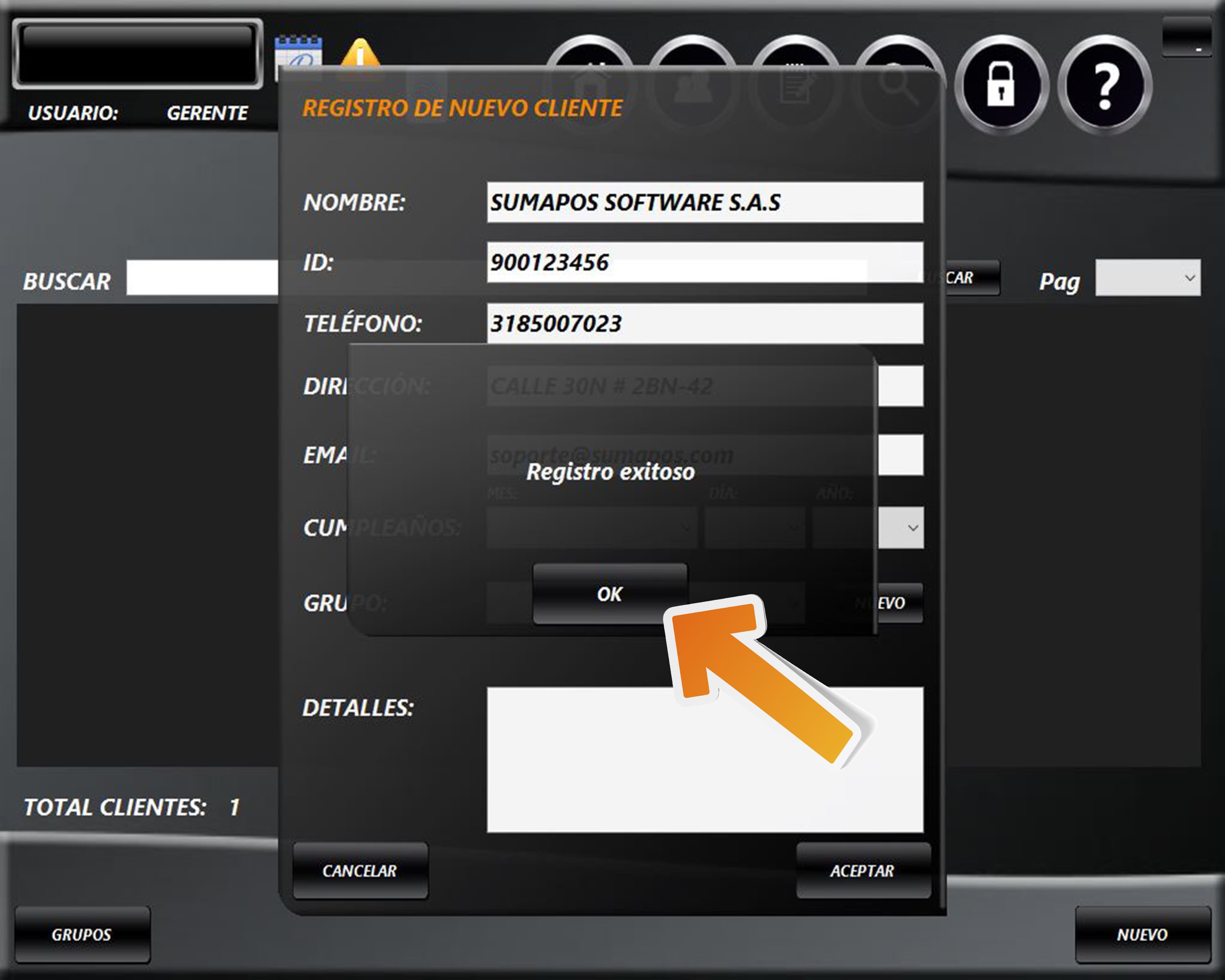 Verificamos que la información del cliente este correcta, que el cliente NO tenga en el ID digito de verificación, que el cliente este como jurídico, cerramos la ventana y queda listo el cliente.