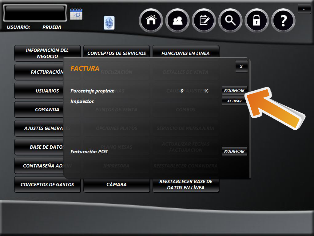 Frente al ítem PORCENTAJE PROPINA seleccione la casilla MODIFICAR.