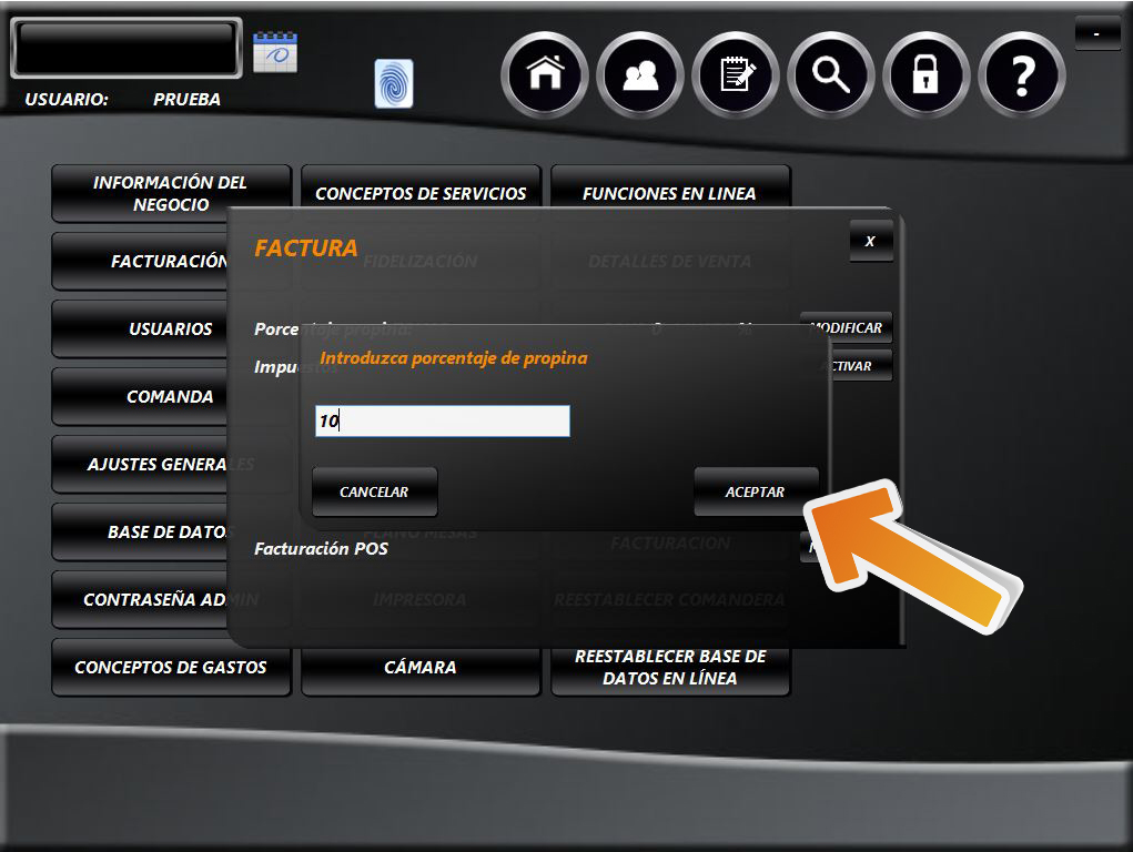 Ingrese el porcentaje de propina sugerido del establecimiento y de clic en ACEPTAR.