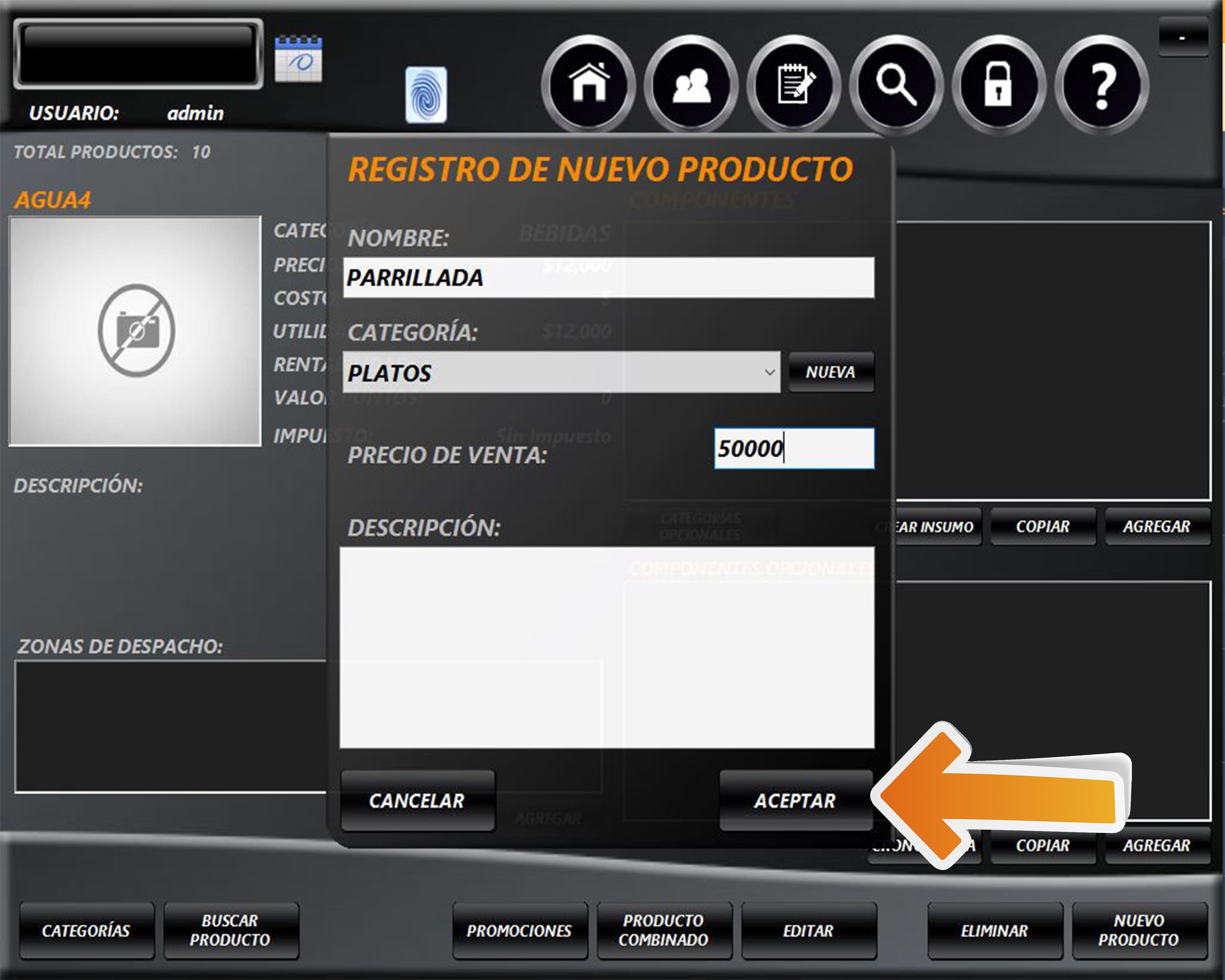 Ingrese el nombre del producto, asígnele una categoría, el precio de venta y, opcionalmente, puede ingresar la información del producto. Dé clic en ACEPTAR.