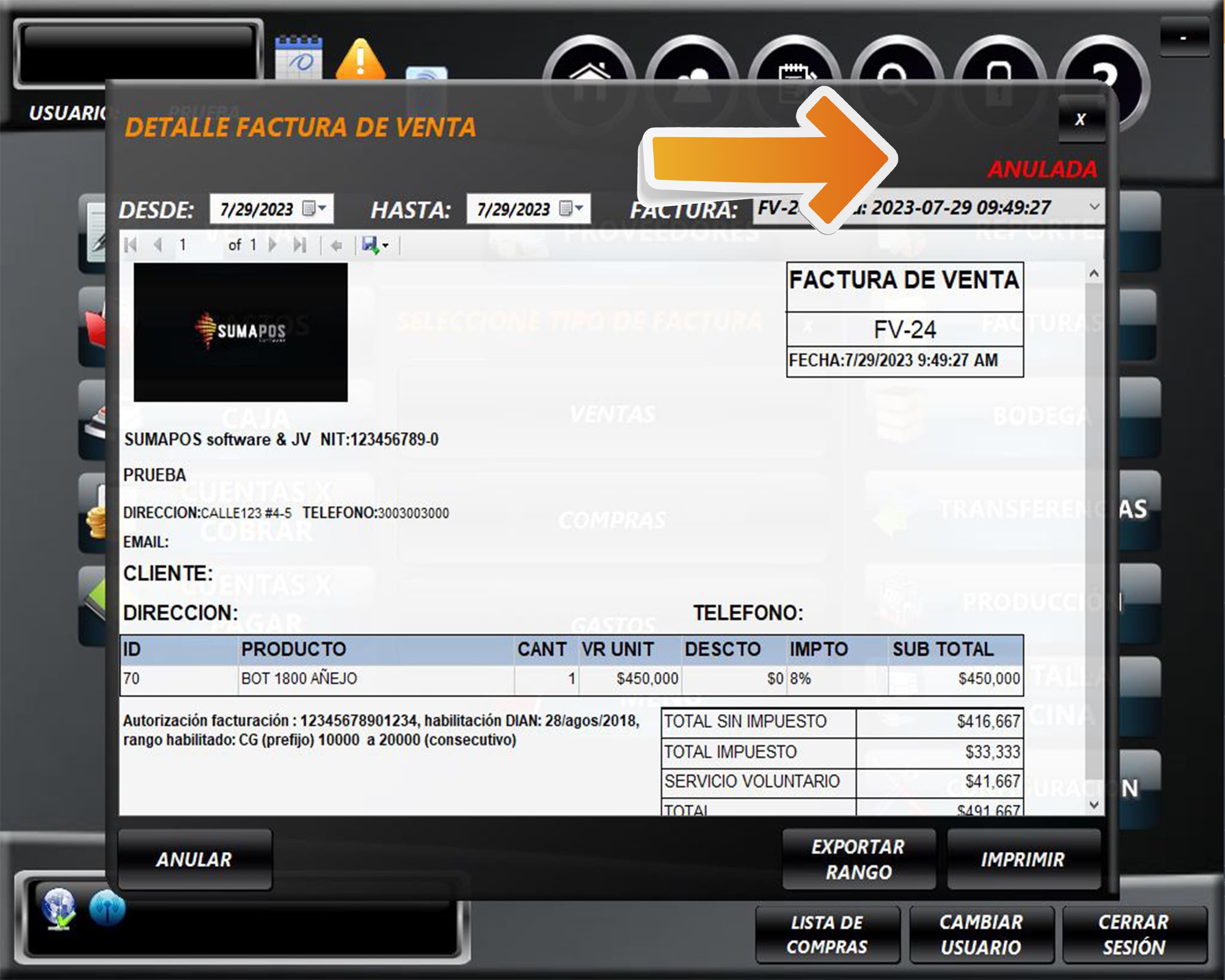 Al buscar nuevamente la factura se visualizará con la marca ANULADA.